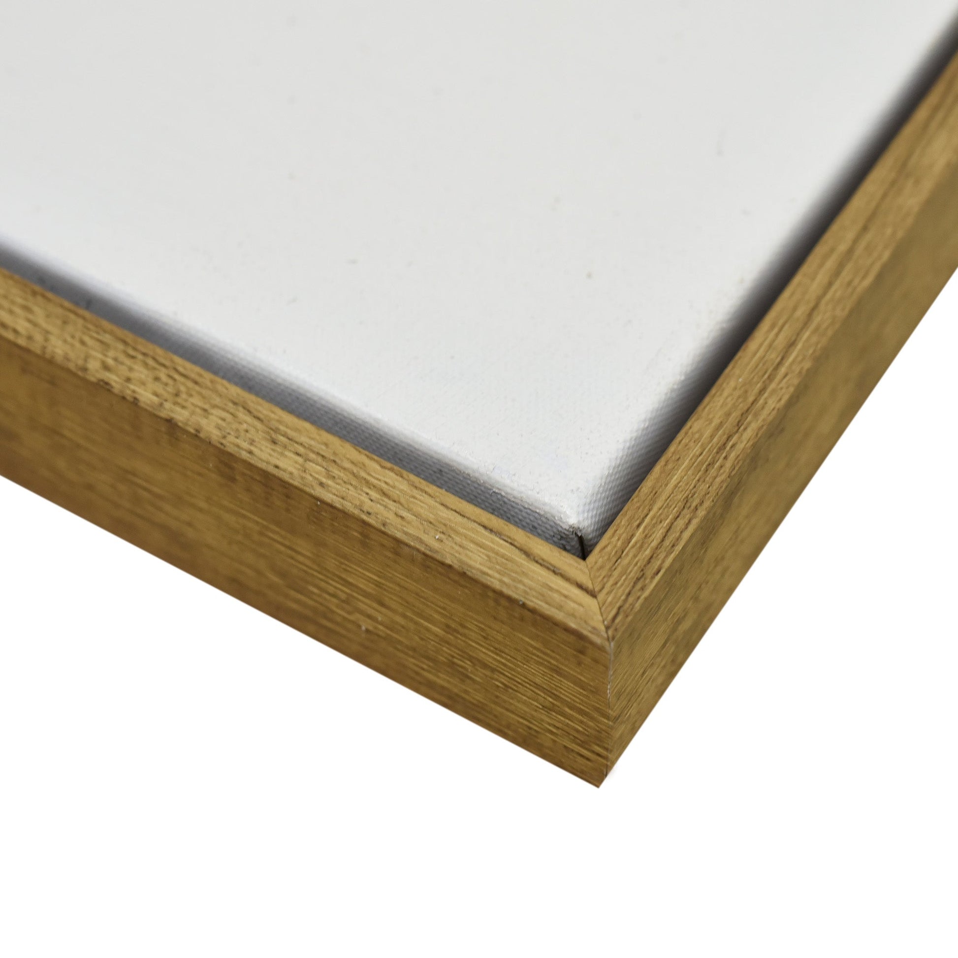 Stretched and gallery wrapped around a wooden stretcher and finished with a floating frame. There is a gap between the frame and print, which creates the floating effect and literally makes the canvas print stand out even more.