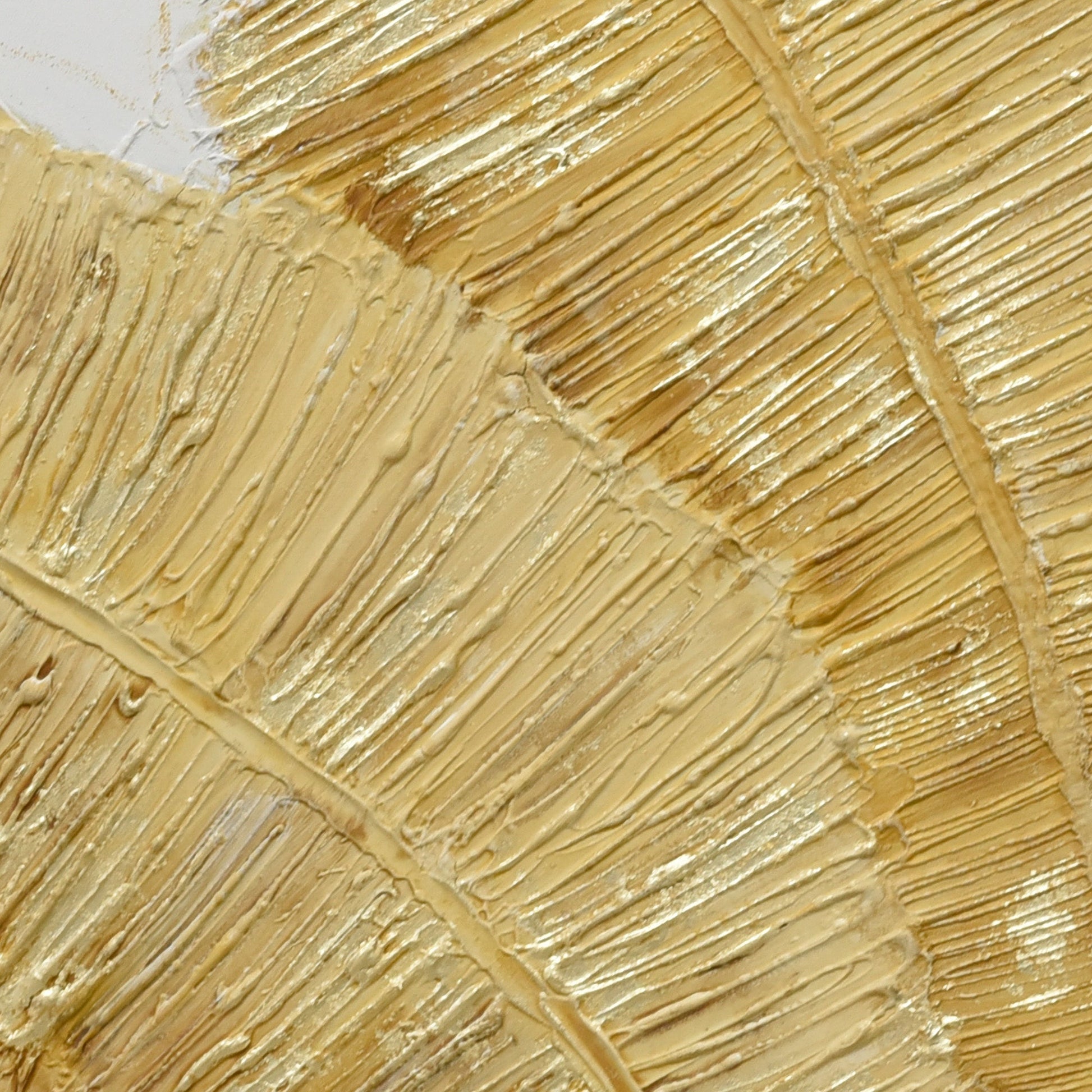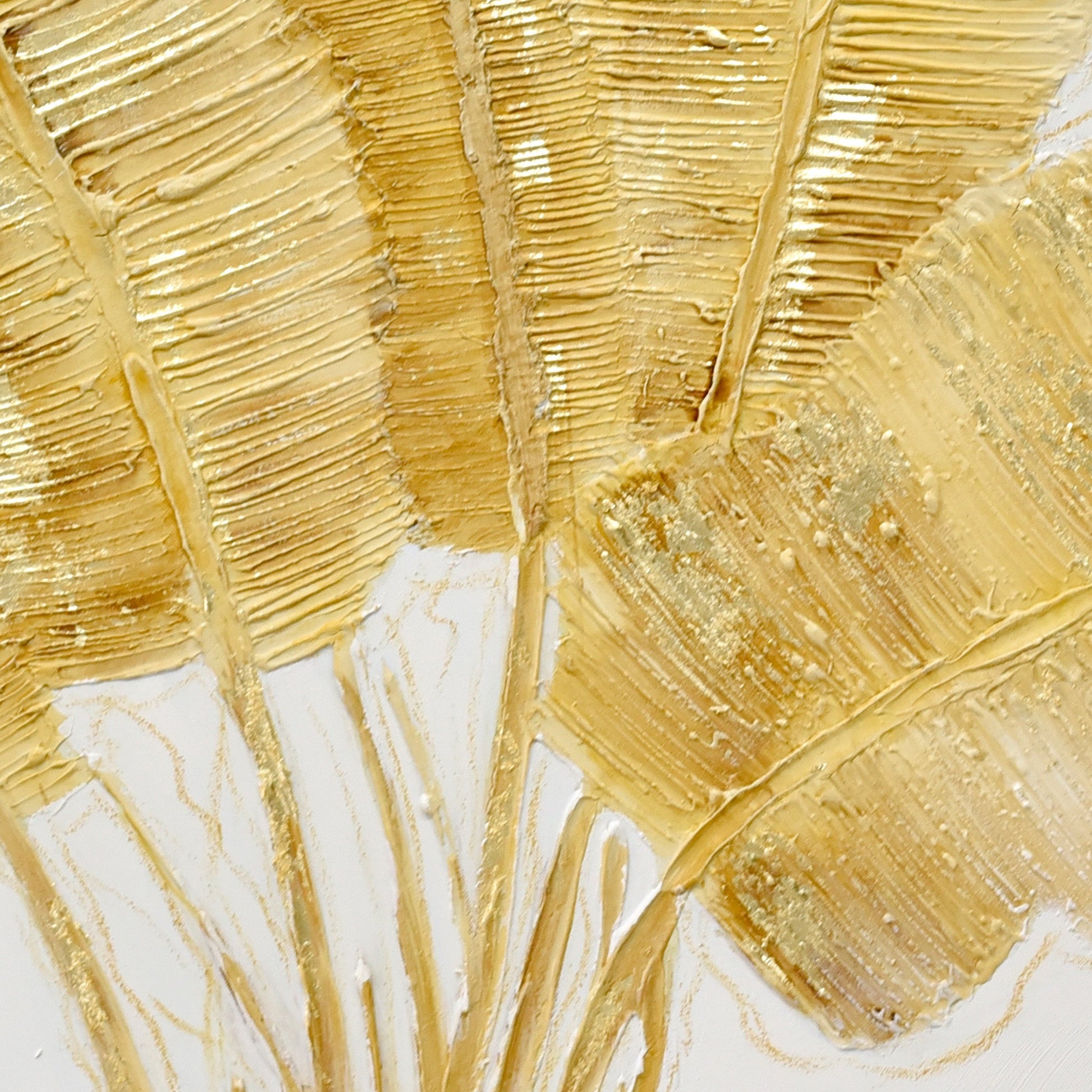 "Lustrous Leaves" is a captivating portrayal of nature's splendor, capturing the essence of the banana plant's leaves in a radiant yellowish-gold hue. Set against a pure white canvas, each of the five leaves is meticulously hand-painted with a heavy texture, emphasizing their intricate patterns and venation. This texture, combined with the luminous color, gives the leaves a tangible, almost three-dimensional quality, inviting viewers to reach out and touch. The dark wood frame juxtaposes beautifully with the bright and shimmering foliage, adding depth and contrast to the composition. "Lustrous Leaves" is not just a visual treat; it's an ode to the beauty of nature, rendered with artistic precision and passion.