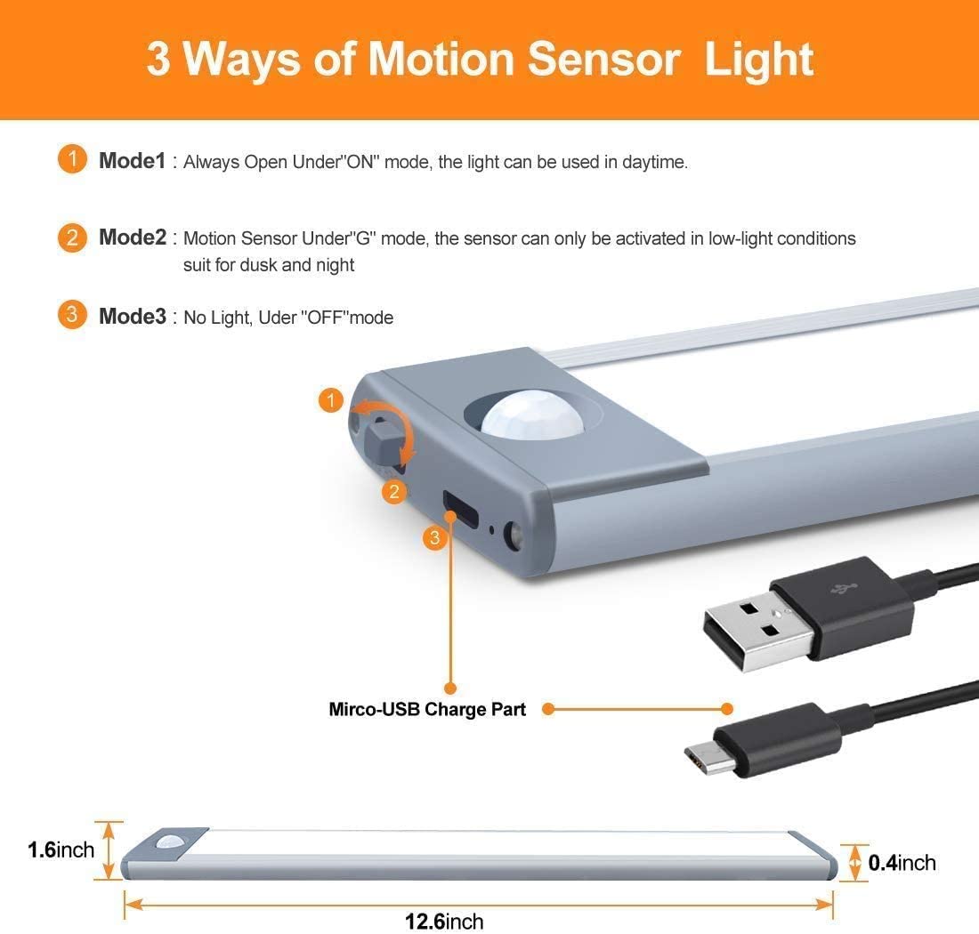 - Built-in Battery, Fast Charging, Upgraded Material, More Durable: The closet led light built-in high-capacity rechargeable battery, you don't need to buy extra batteries! Required 1-2 hours to charge, easy to charge in the laptop, power bank. Led closet lights can be used continuously for 5 hours in the on mode, and used continuously for 1-2 months in the motion sensor mode. Very long use time!