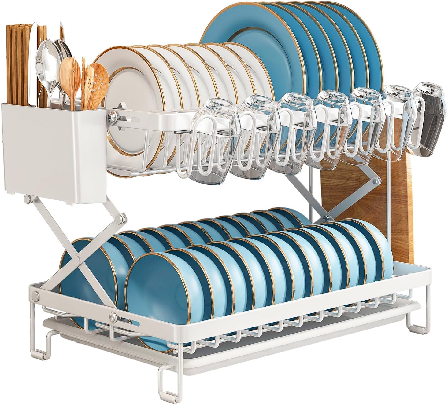 - 2-TIER LARGE CAPACITY DESIGN: Maximize your countertop space with a double-layer structure that holds up to 13 plates on the top rack and 22 bowls on the lower tier. Additional zones accommodate cups, utensils, and cutting boards — perfect for compact kitchens.