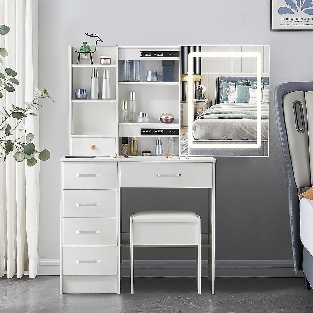 - Flawless Lighting for Every Look - The built-in LED mirror features three colour modes and adjustable brightness, ensuring the perfect lighting for your makeup application. Plus, the movable mirror reveals hidden storage space behind itbeauty and function combined!
