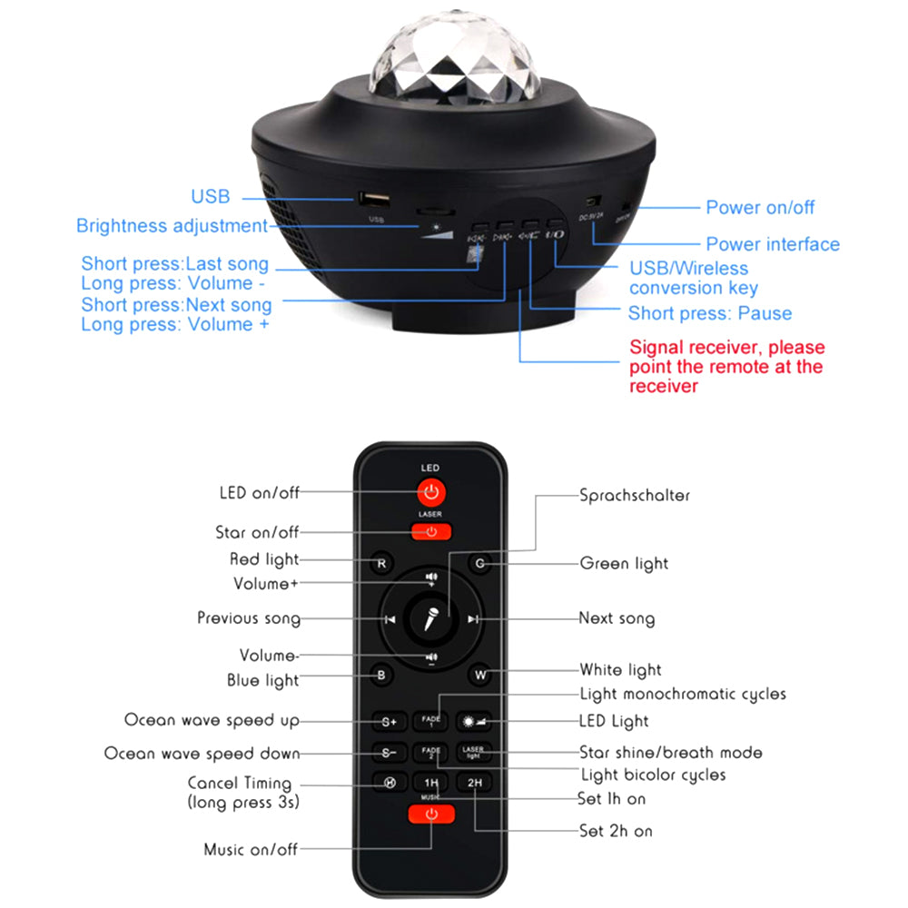 Remote-controlled voice-controlled automatic closing timer]: the latest remote-controlled wave night light projector with voice-controlled flashing mode. Turn the lights on/off freely, change the lighting mode, recycle the lighting effect, adjust the brightness, startop the movement or adjust the volume. The acoustic motion sensor allows the projection to change color according to the beat of music or clapping, thus producing disco or party effect. Three auto-off timer options with built-in 1H/ 2H/ off.