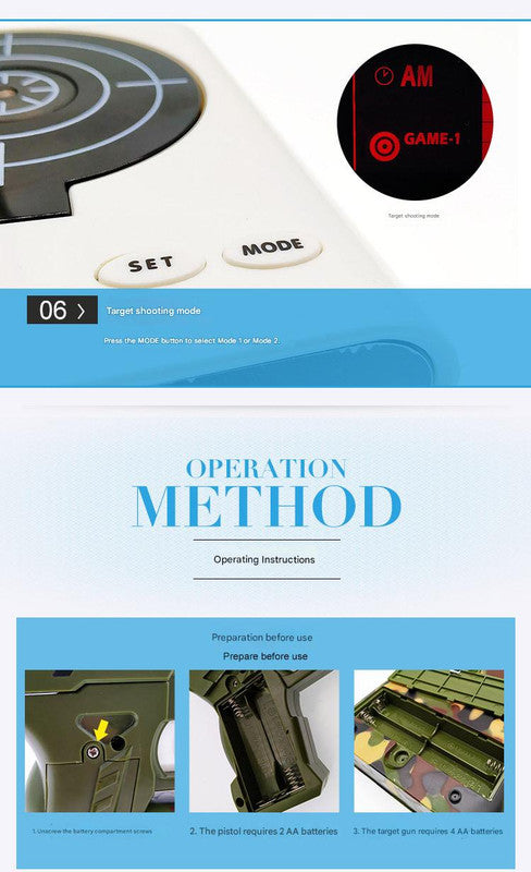 - Two Game Modes: Includes target practice game modes (Mode 1 and Mode 2) for entertainment.
