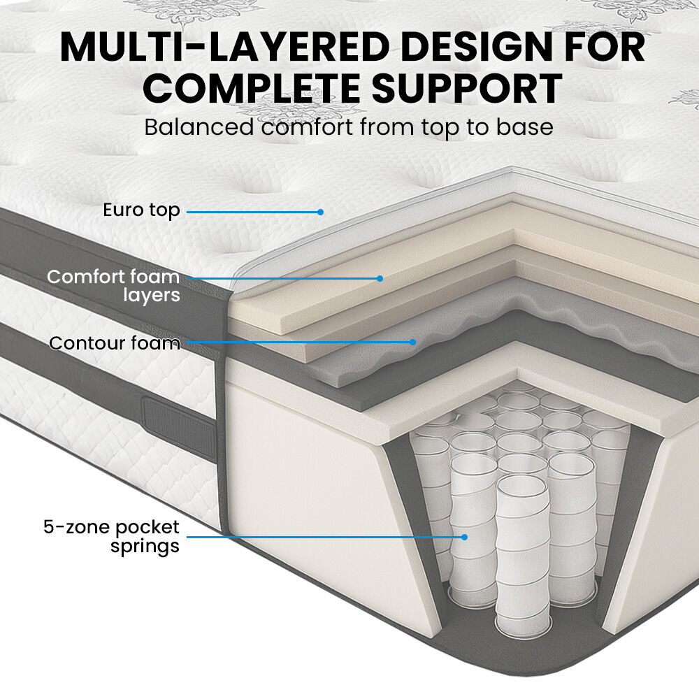 Beneath the comfort layers, a 5-zone pocket spring system adapts to your body's shape, with each zone responding to key pressure points like the shoulders, back, and hips. Individually wrapped springs move independently to absorb movement and reduce partner disturbance, supporting a more peaceful sleep for two.