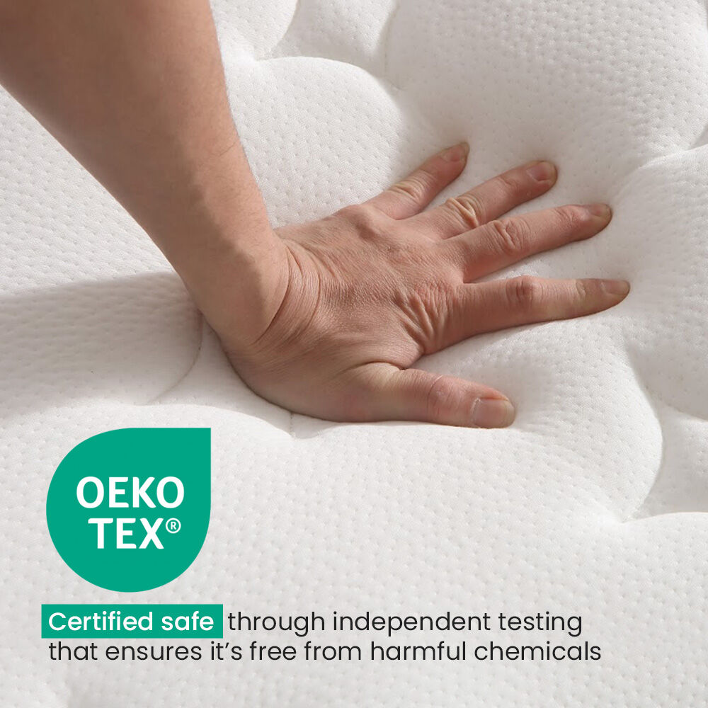 A Euro top finish is paired with OEKO-TEX certified knitted fabric, offering a smooth, breathable surface that's gentle on the skin and certified to be free from harmful substances. This plush upper layer contours gently to your body, enhancing comfort while promoting airflow for a cooler, more hygienic sleep environment.