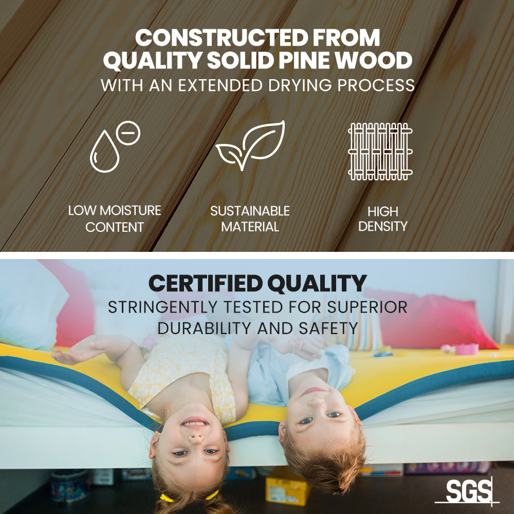 The Kingston Slumber Triple Bunk Bed Frame is crafted from solid high-quality sustainably sourced timber and is compatible with standard Australian single and double sized mattresses. Safety is paramount with SGS-certified quality, rigorously tested for superior durability. The bed features durable plywood slats and a solid, secure ladder. It even features an exclusive toy shelf which is sure to be a nice home for their favourites.