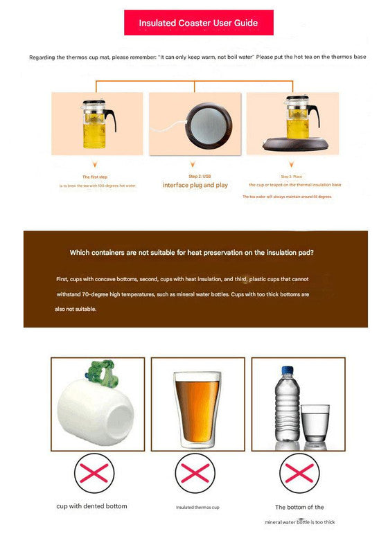 - Constant Temperature Maintenance: Keeps your hot beverage warm (around 55℃), preventing it from cooling down. Please note: This device is designed to keep warm drinks warm, not to heat cold drinks quickly or boil water.